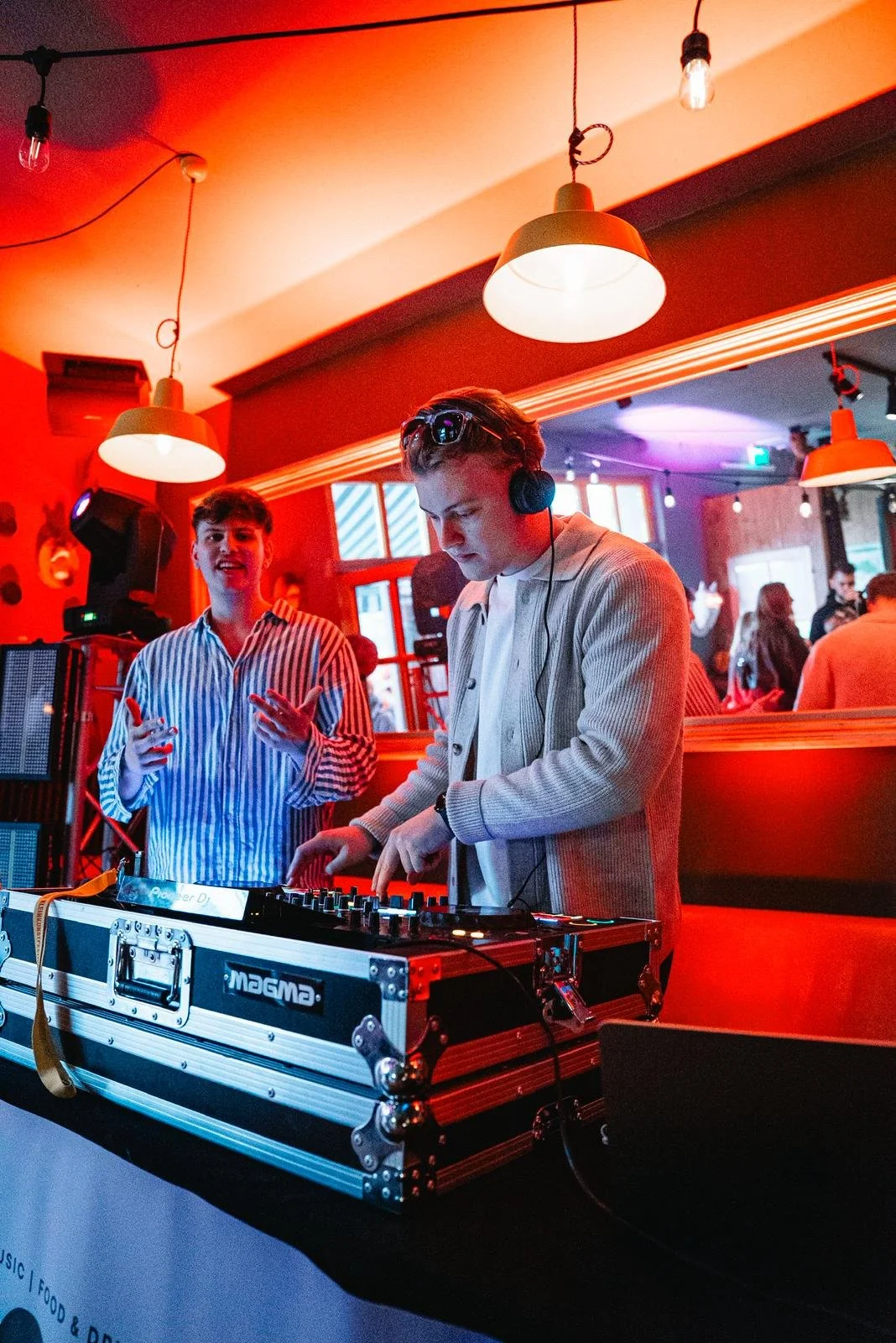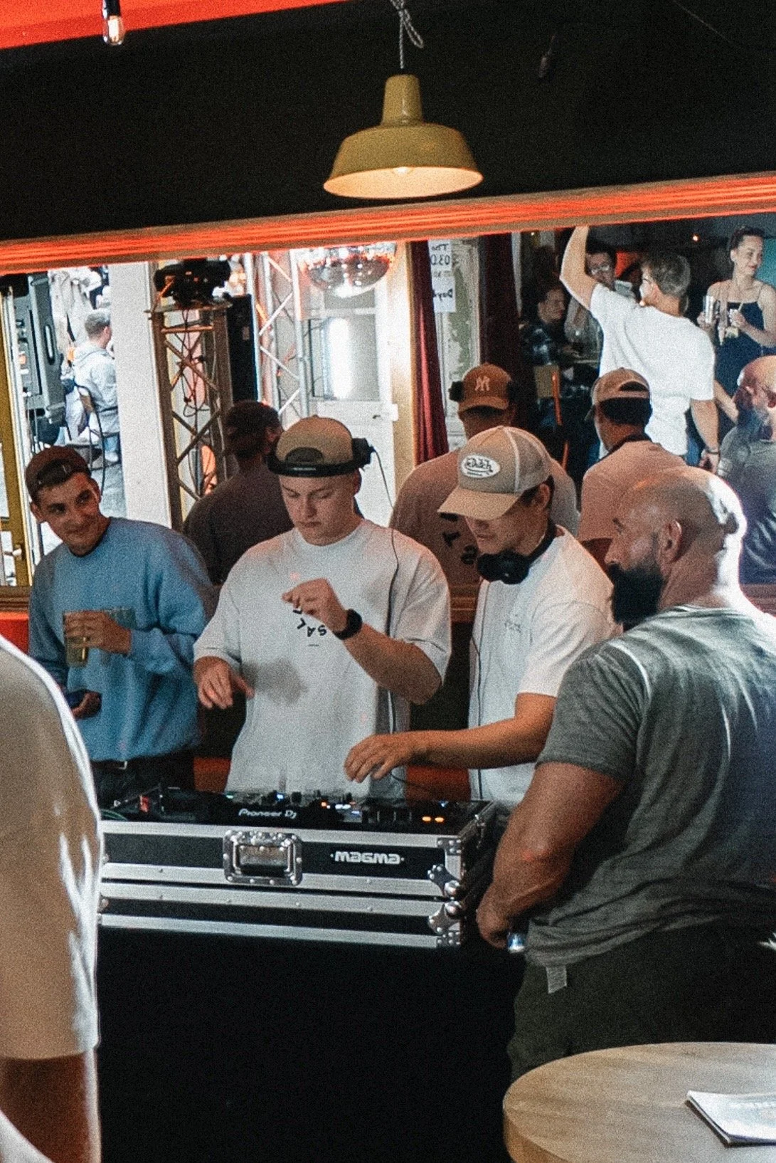Junge DJs mit Kopfhörern und Musik-Equipment, die in einer Bar oder einem Club auflegen, während im Hintergrund Menschen tanzen und feiern.
