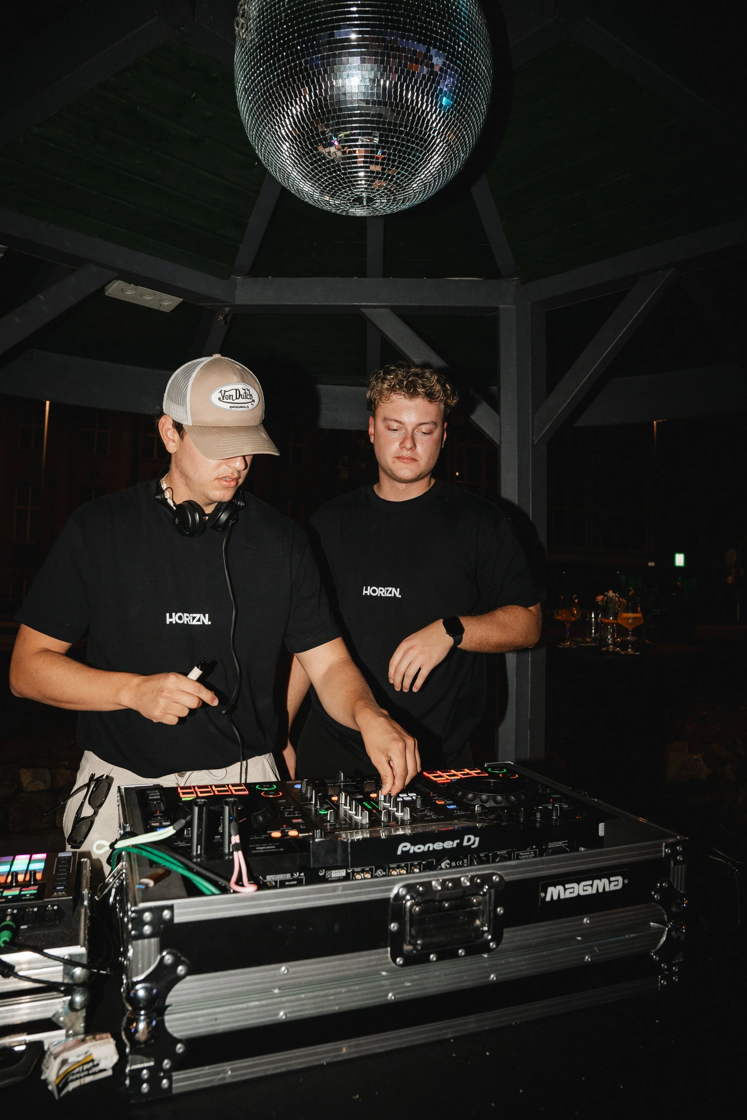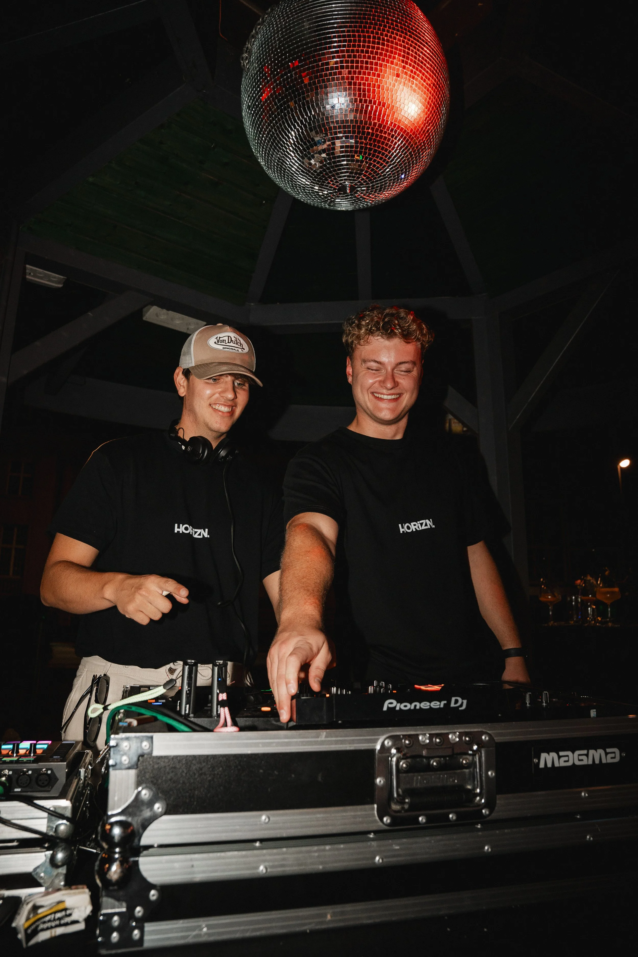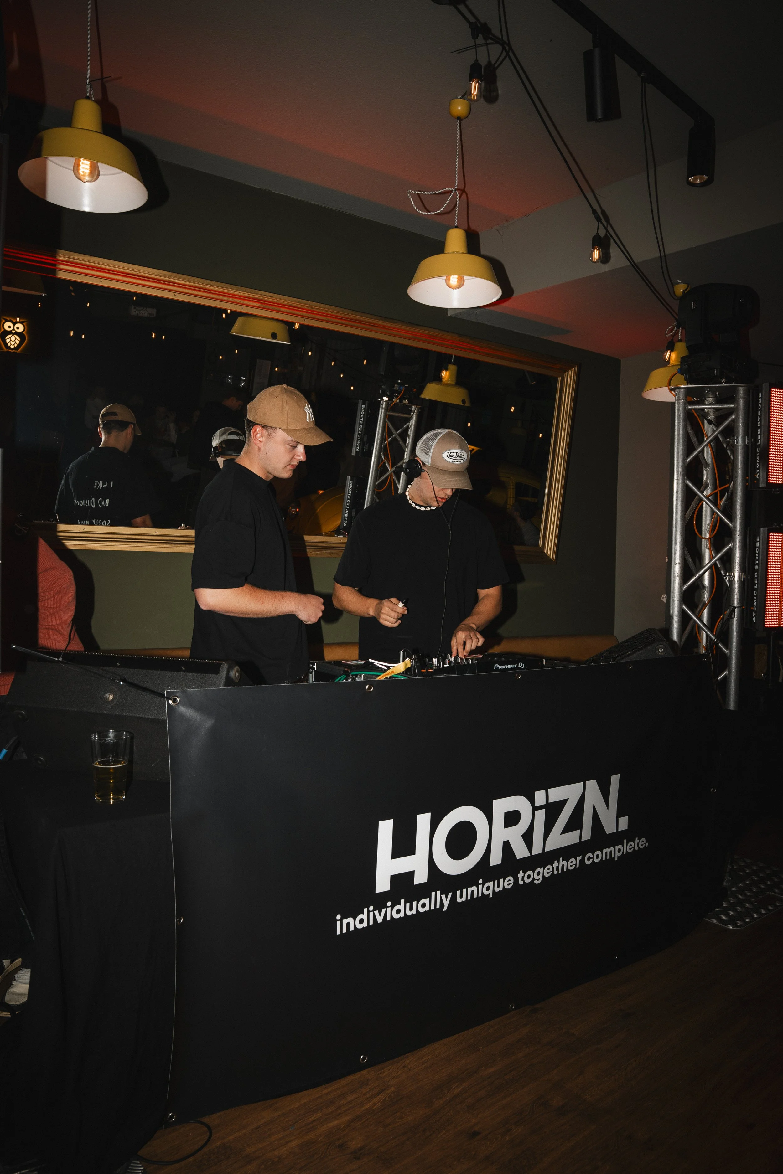 Zwei DJs spielen auf einer Party hinter einem DJ-Pult, das mit der Aufschrift 'HORIZN. individually unique together complete.' bedeckt ist, während bunte Lampen und ein großes Wandspiegel im Hintergrund sind.