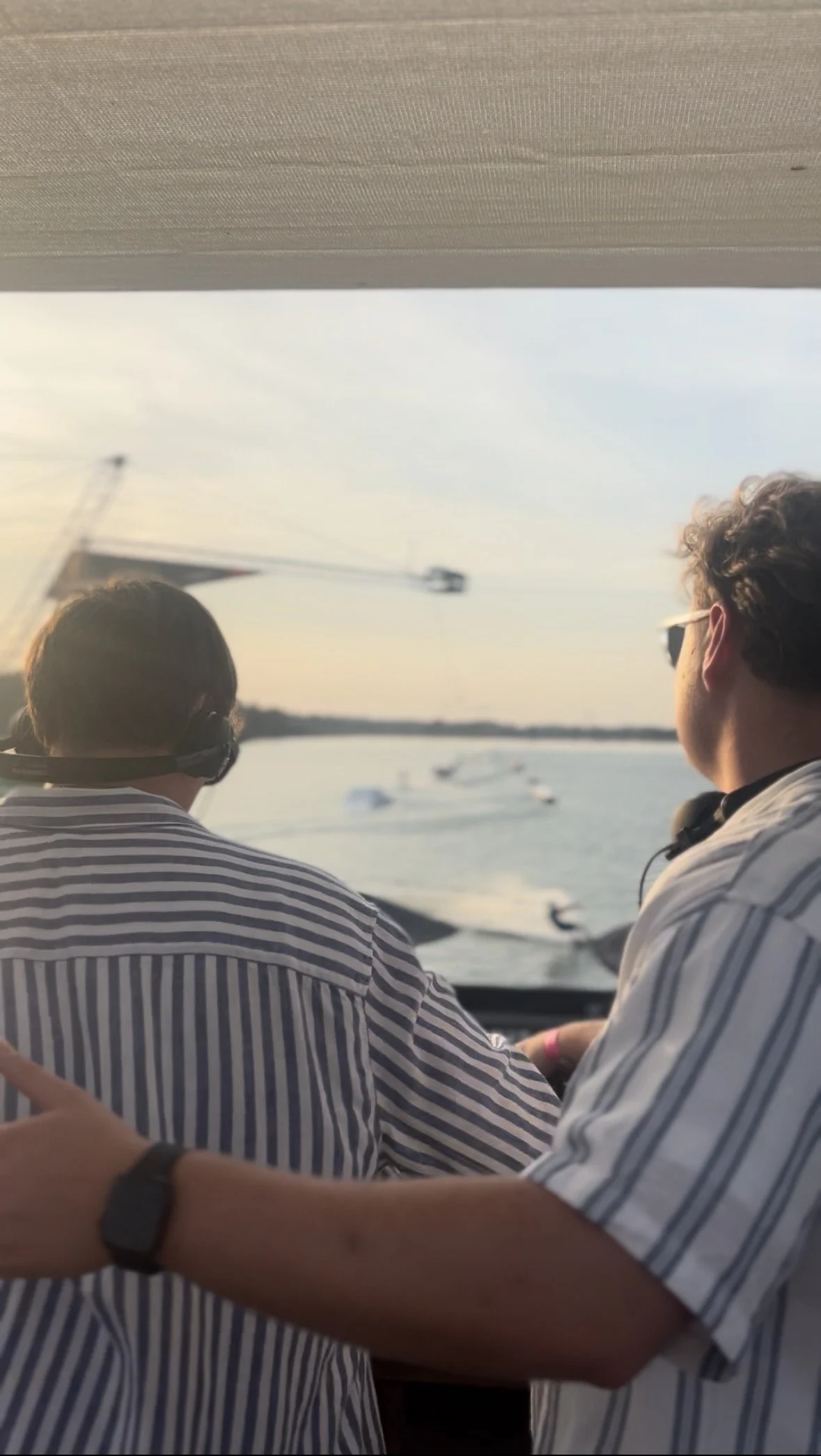 Zwei Männer auf einem Boot, die ein Wasserflugzeug am Himmel beobachten, im Hintergrund Wasser mit mehreren Booten, bei Sonnenuntergang.