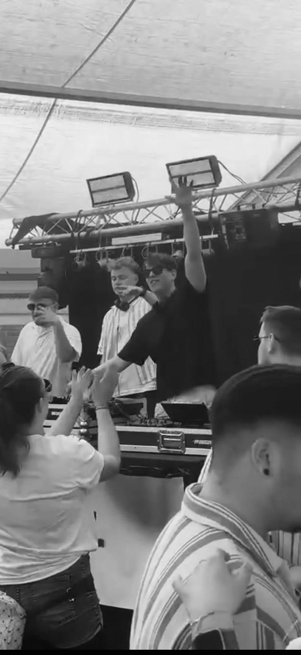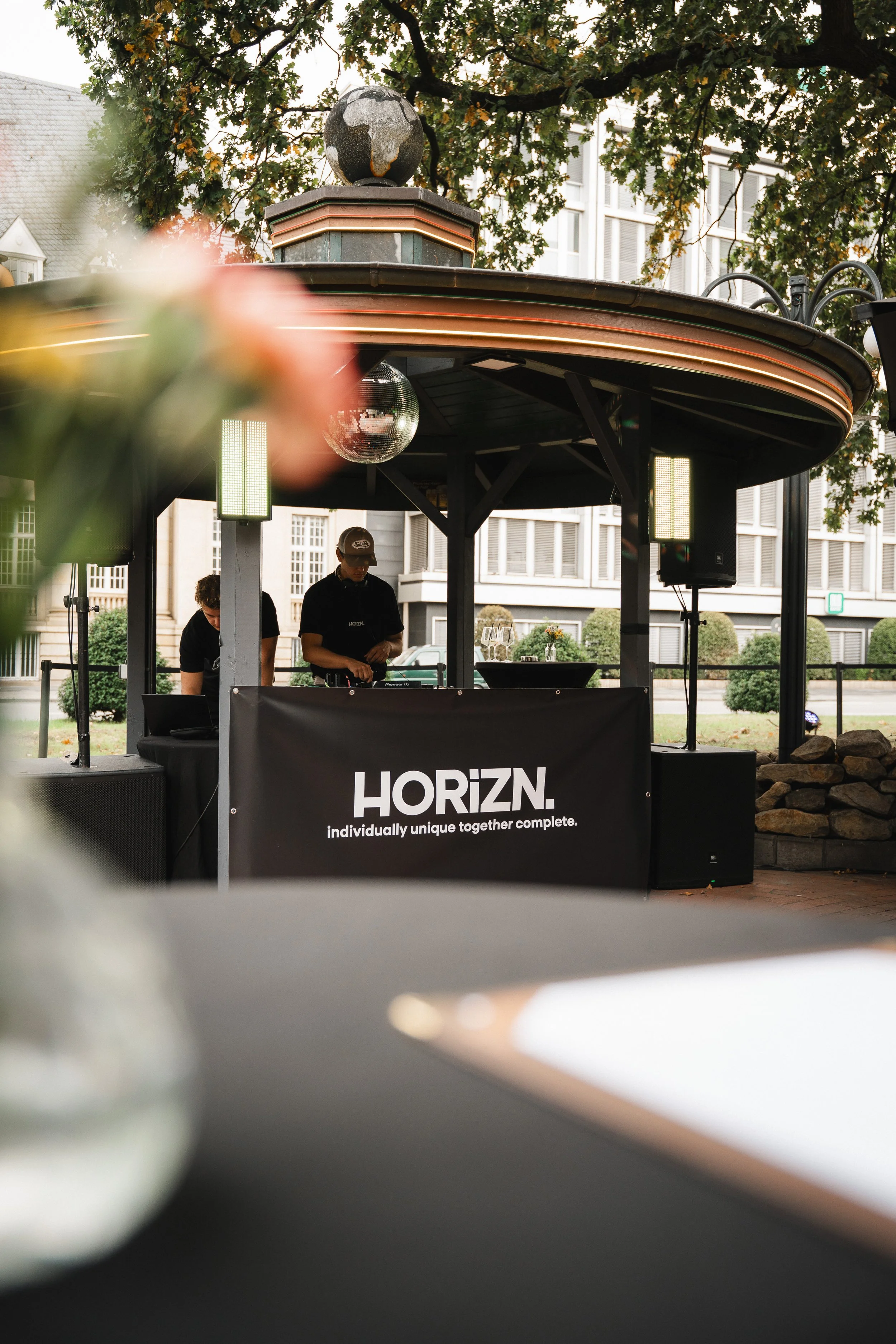 DJ auftreten bei einer Veranstaltung im Freien, mit einem schwarzen Banner, auf dem  horinz. geschrieben steht und die Worte 'individually unique together complete.' zu lesen sind.
