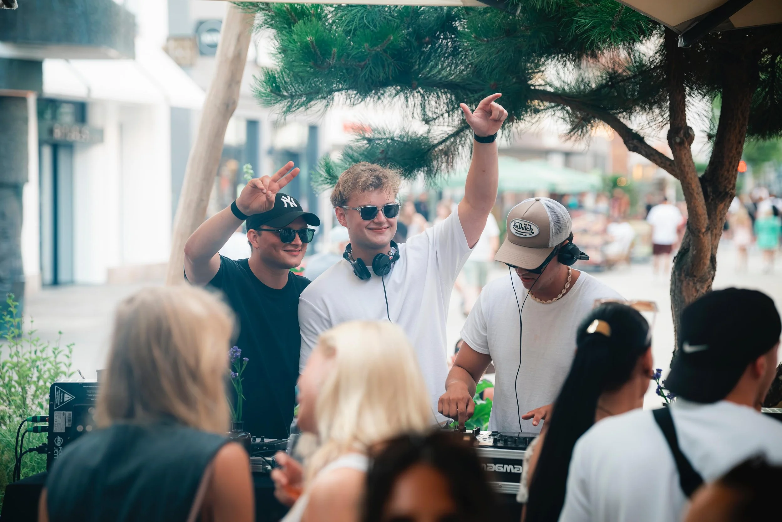 Eine Gruppe junger Menschen, die als DJs an einem festlichen Outdoor-Event hinter einem DJ-Pult arbeiten, während andere Gäste im Vordergrund am Tisch sitzen und sich unterhalten, im Hintergrund sind Bäume und Gebäude sichtbar.