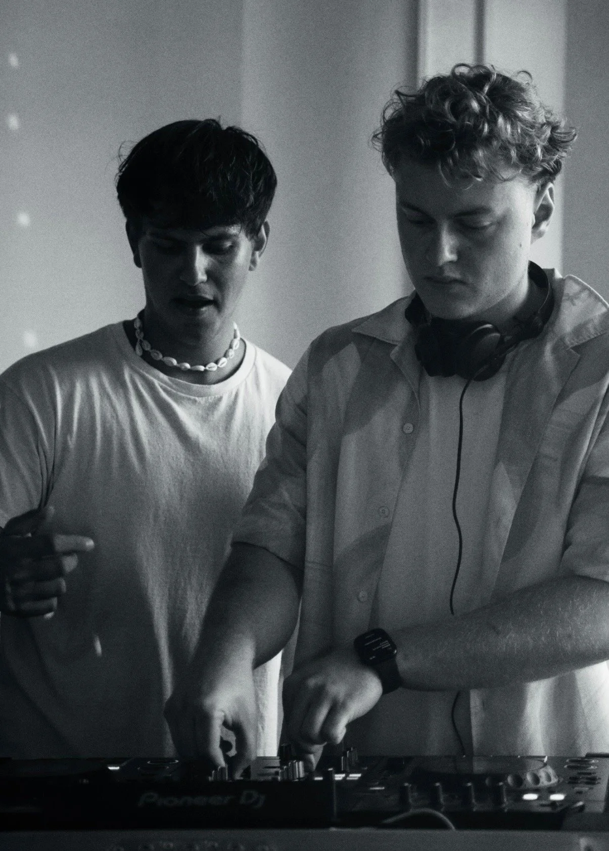 Zwei junge Männer beim Auflegen mit DJ-Equipment in einem dunklen Raum, schwarz-weiße Aufnahme.