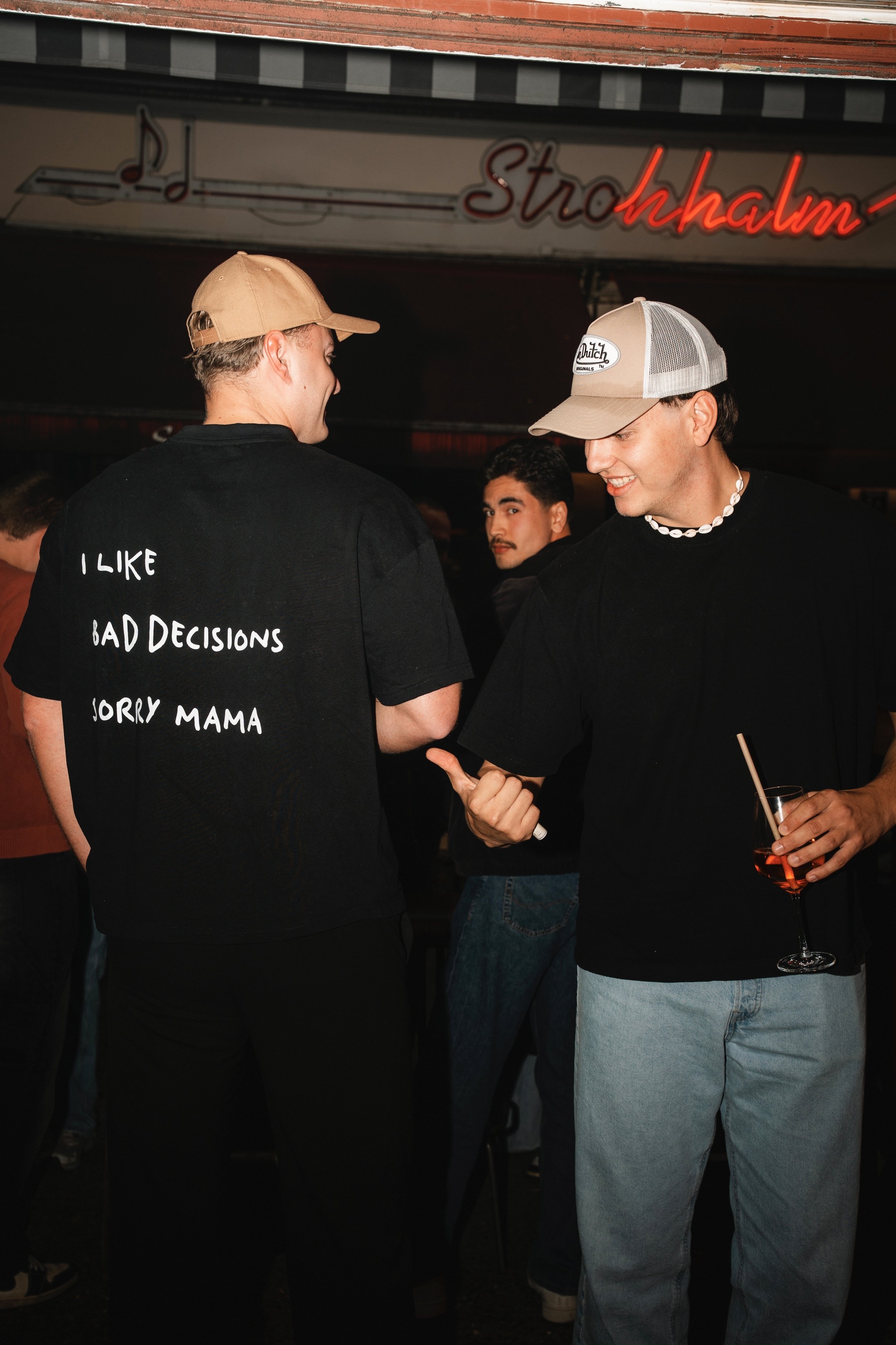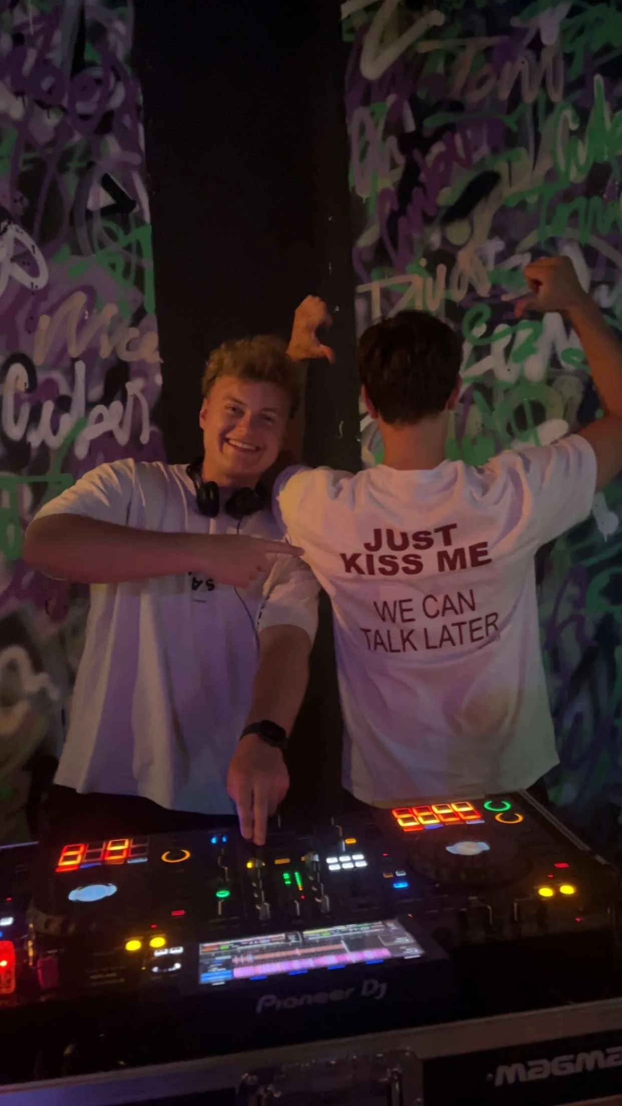 Zwei junge Männer an einem DJ-Pult in einer graffitibeschmückten Umgebung. Einer zeigt mit dem Finger auf den anderen, der lächelnd eine Hand in Richtung Kamera hält. Der Rücken des einen ist sichtbar, mit dem Text 'JUST KISS ME WE CAN TALK LATER'.