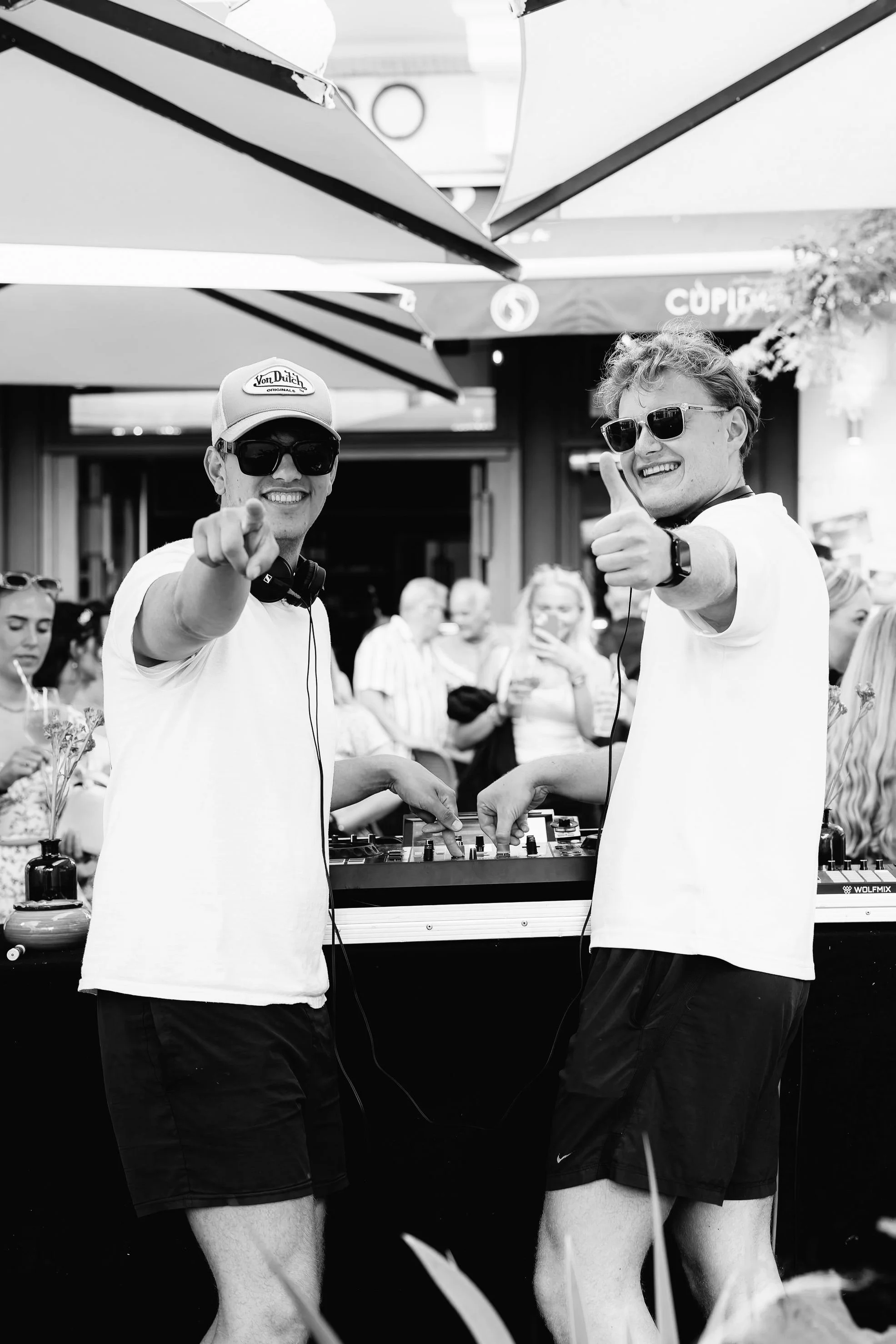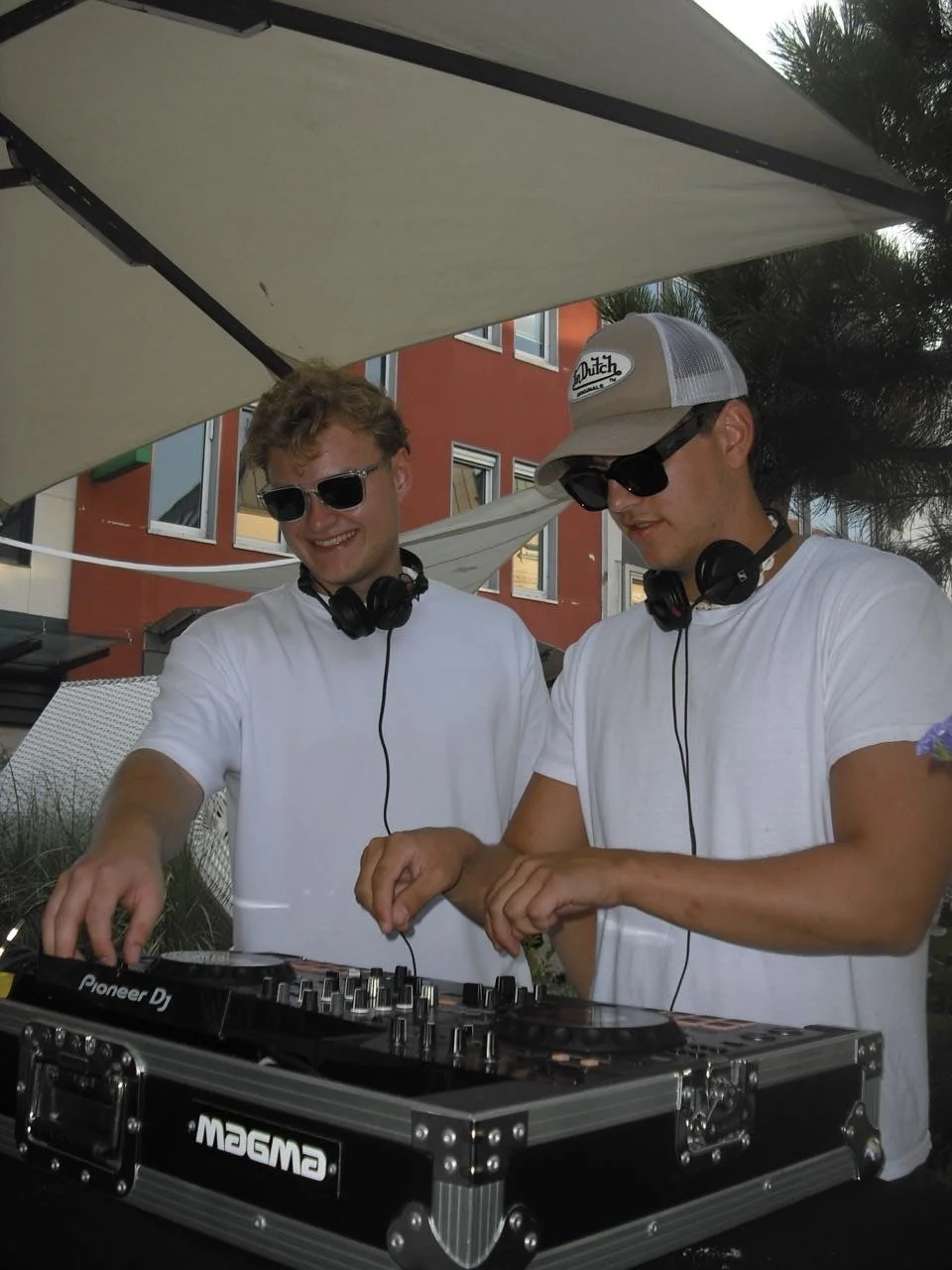 Zwei junge Männer beim DJing, beide tragen weiße T-Shirts, Sonnenbrillen und Kopfhörer, einer trägt eine Cap, sie sind in einem Außenbereich mit Gebäuden im Hintergrund, eine Sonnenbank und ein Sonnenschirm sind sichtbar.