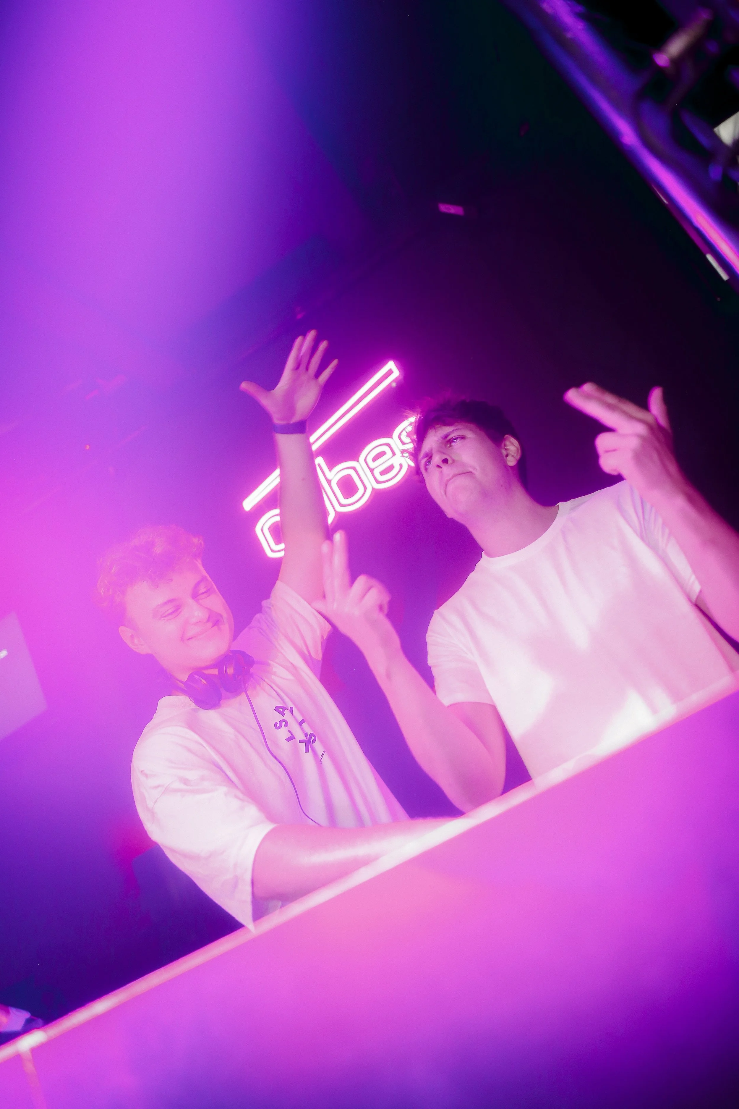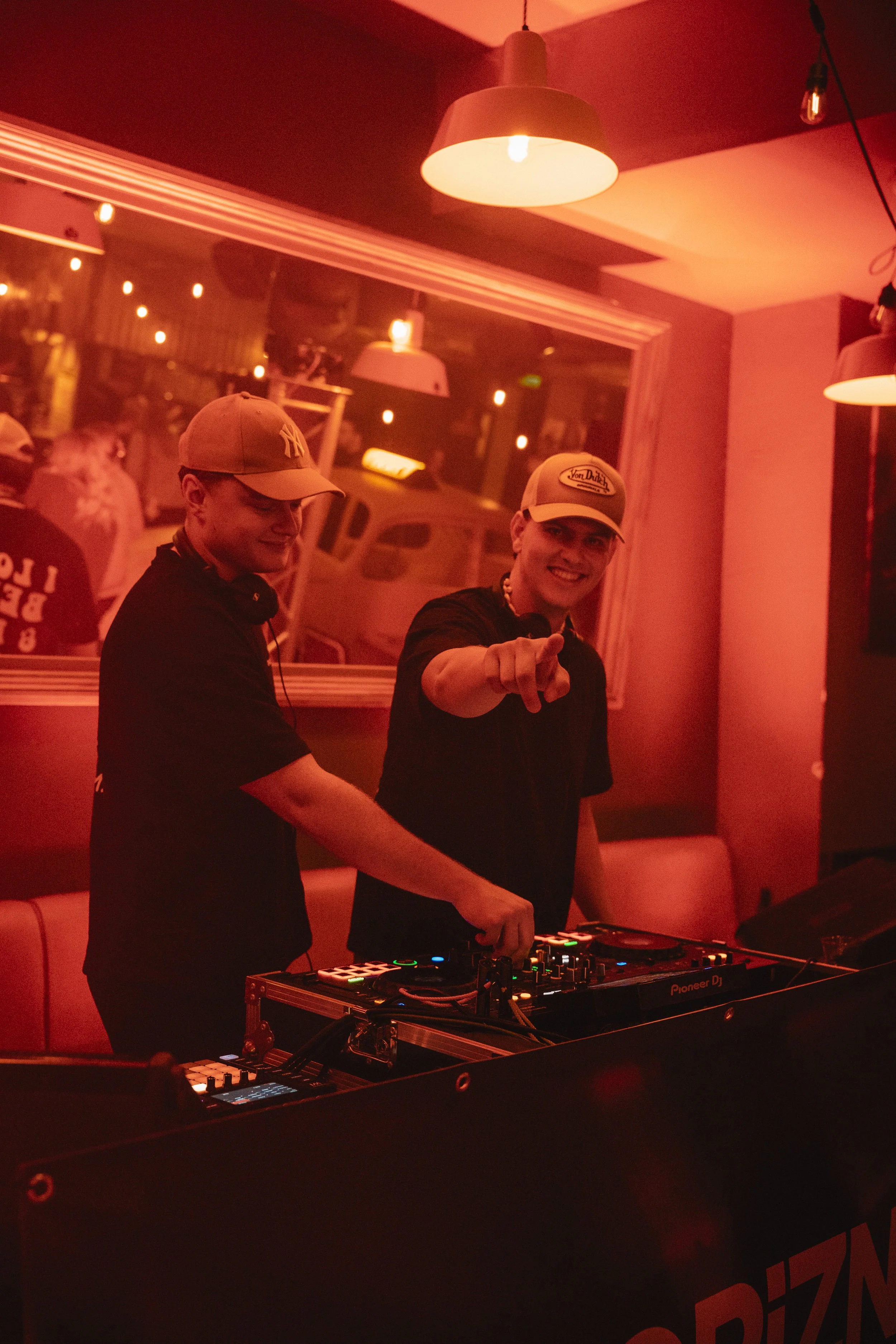 Zwei junge Männer tanzen an einem DJ-Pult in einer Bar, einer zeigt mit dem Finger, beide tragen Mützen und lächeln, die Umgebung ist rot beleuchtet.