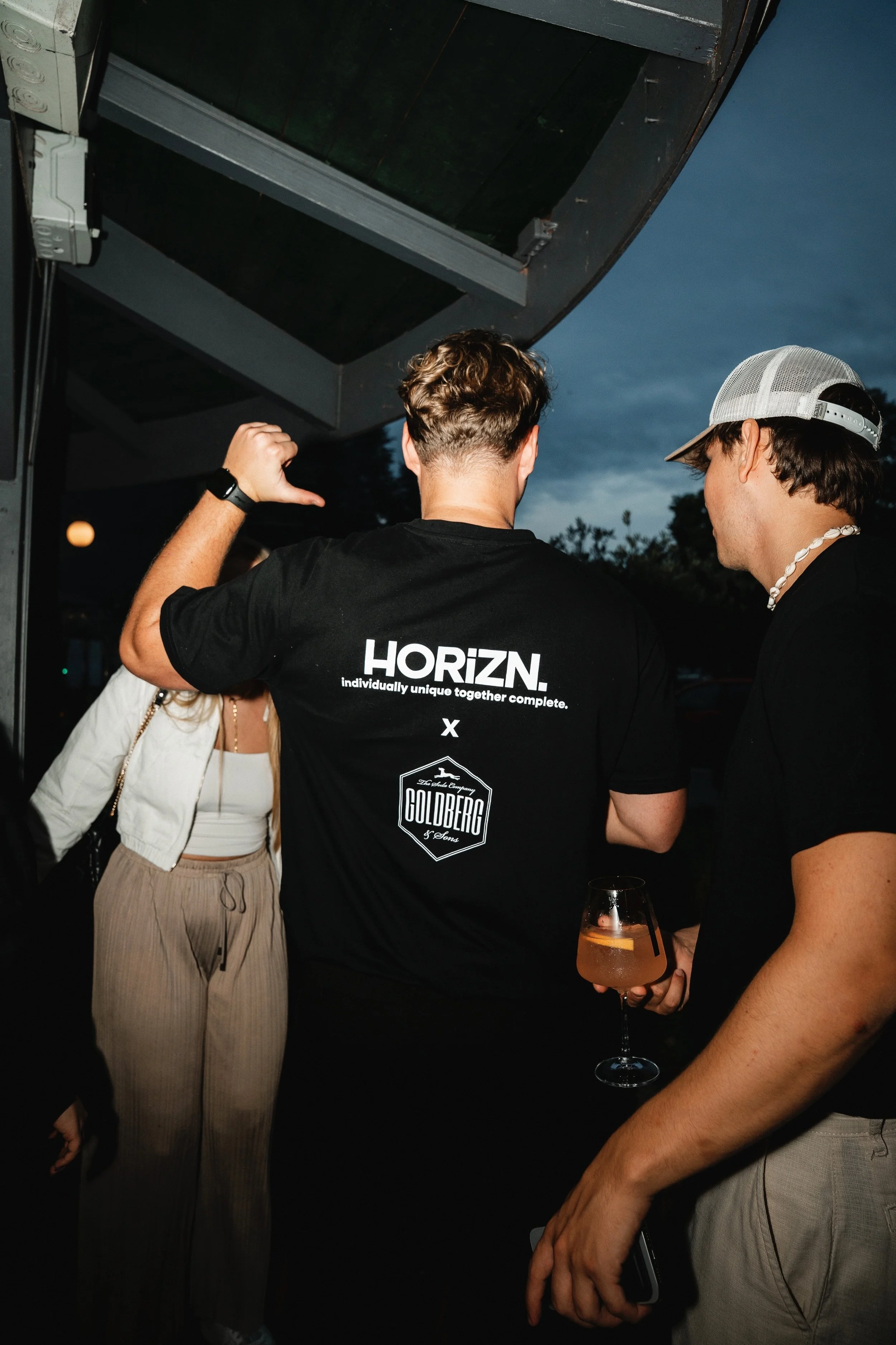 Zwei Männer im Gespräch bei einem Abend-Event, einer trägt ein schwarzes T-Shirt mit dem Logo 'HORIZN.' und 'GOLDBERG', der andere hält ein Getränk in der Hand.