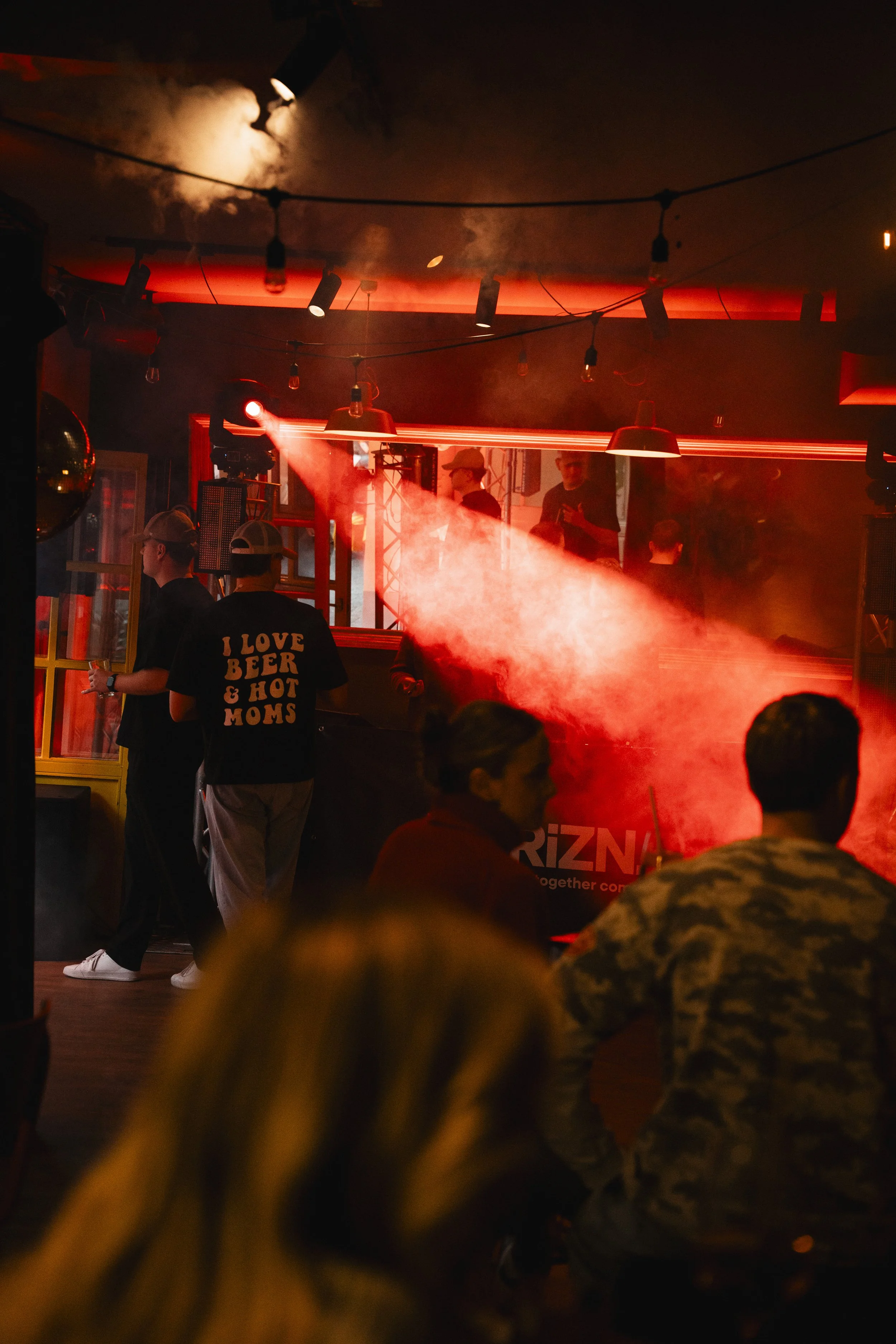 Menschen in einer dunklen, neonbeleuchteten Bar mit rotem Licht und Rauch, einige stehen und sitzen, während DJs im Hintergrund auflegen.