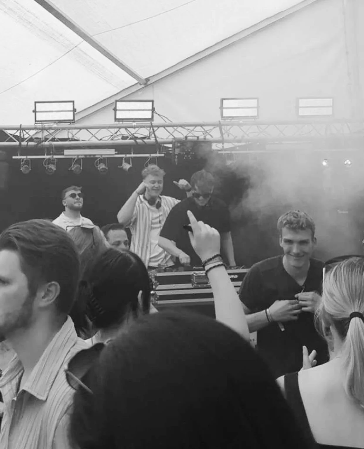 Zwei junge Männer tanzen und lachen vor einem DJ-Set. Sie tragen Sonnenbrillen und T-Shirts, eine Person trägt einen Baseballcap, im Hintergrund feiern weitere Menschen an einem Freiluft-Event.